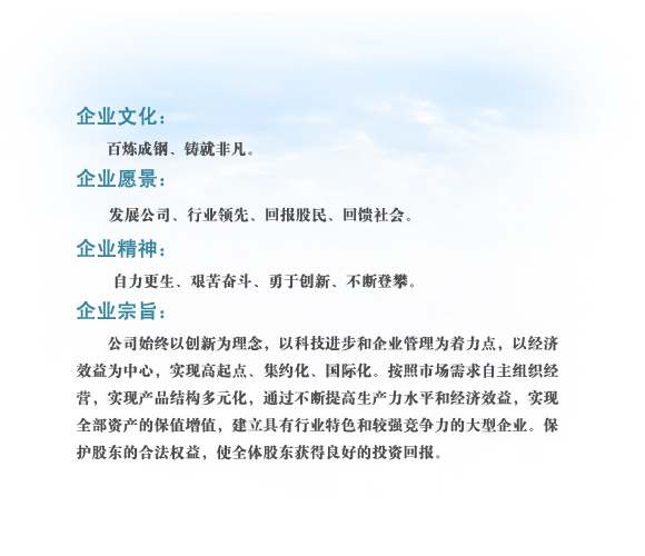 我們不斷創(chuàng)新,不斷進步,我們與您攜手一起共創(chuàng)美好明天。 企業(yè)精神:品質(zhì)、素養(yǎng)、信譽 質(zhì)量方針:盡善盡美、一諾千金 經(jīng)營理念:秉持公平、互惠互利
